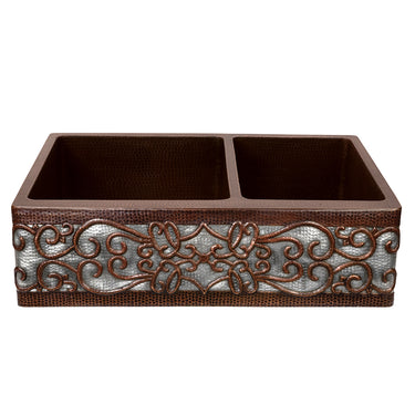 33" Hammered Copper Apron Front 60/40 Double Basin Kitchen Sink w/ Scroll Design and Nickel Background
